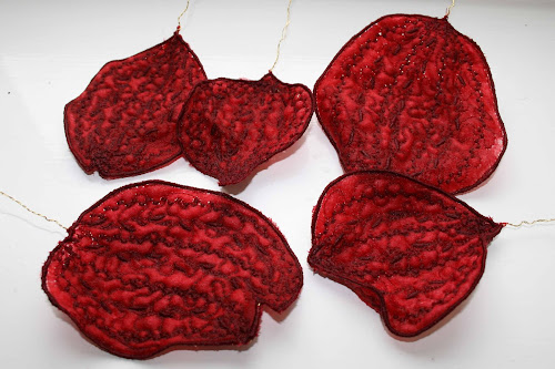 Repeat this process making around 5 petals of various shapes - I went for seed head shapes in slightly different sizes. Next to drop the feeds on your machine and do some free stitching - it really can be anything that is relatively open. You may find it easier to wait to trim back the fleece around the shape so that you have more to hold while you are stitching. I like to use a rayon thread for this project as it has a lovely sheen against the fibres.